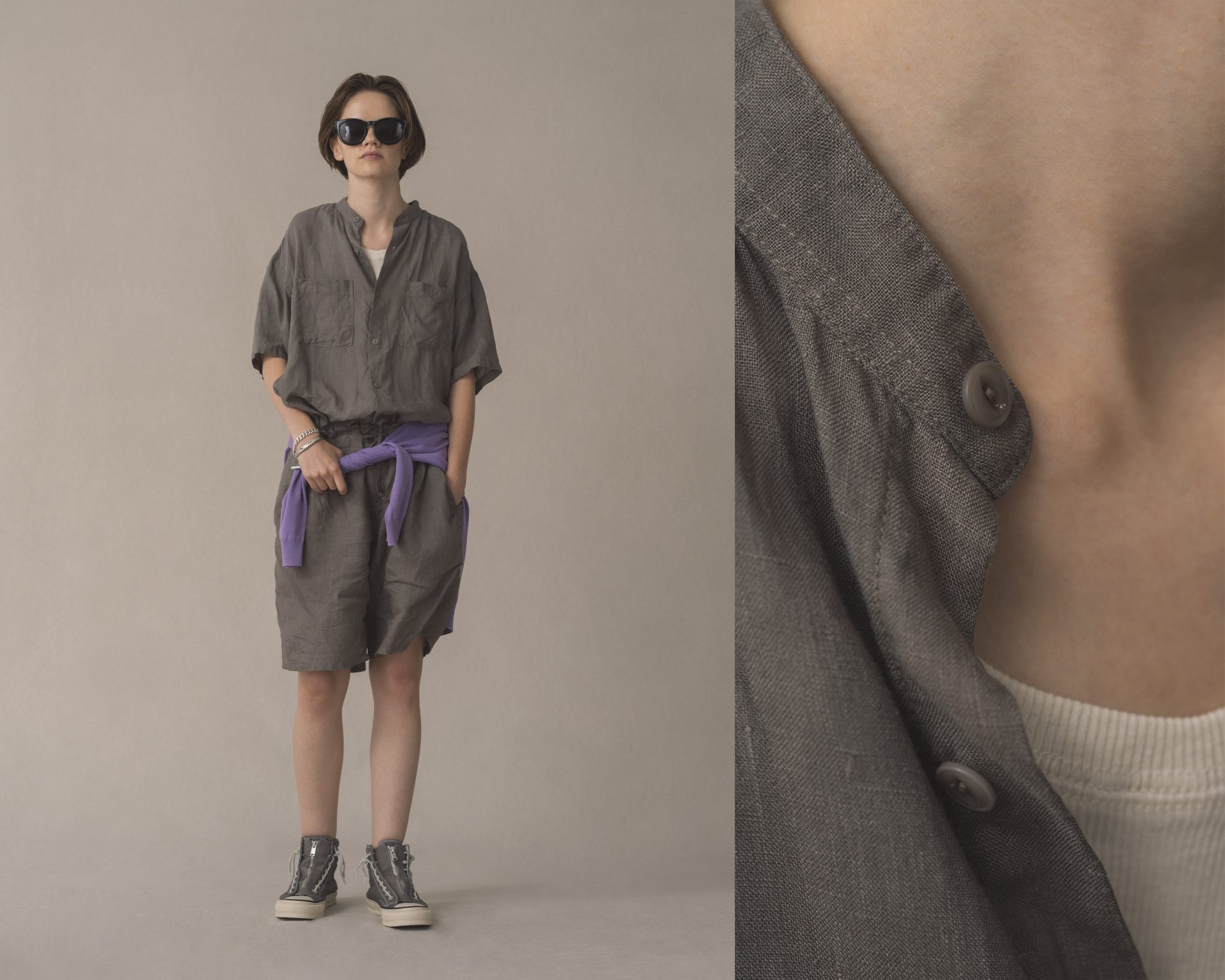 - OFFICER STAND COLLAR S/S SHIRT LINEN CANVAS
